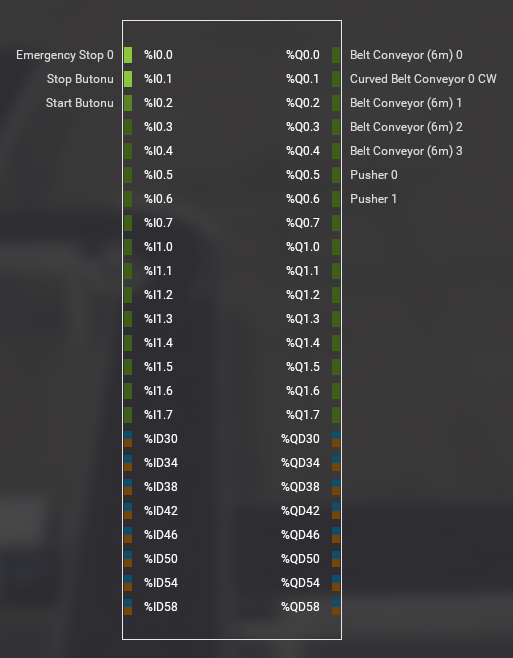 Factory I/O ortamında sahneye eklenen konveyör üzerinde yayıcı (Emitter) aracılığı ile mavi hammadde ve yeşil hammadde (Blue Raw Material, Green Raw Material) üretilecektir. Simülasyon çalışmaya başladığında “Start” butonuna basılınca konveyör hareket etmeye başlayacak, 1. kontrol noktasında kamera mavi hammadeyi görünce “Pusher-1” mavi hammaddeyi ileri itecek ve başlangıç konumuna dönecektir. 2. kontrol noktasında kamera yeşil hammaddeyi görünce “Pusher-2” yeşil hammaddeyi ileri itecek ve başlangıç konumuna dönecektir. Simülasyonun herhangi bir anında “Acil Stop” veya “Stop” butonuna basılınca konveyör hareketini durduracaktır. Tekrardan “Start” butonuna basılması durumunda sistem kaldığı yerden çalışmasını sürdürecektir.