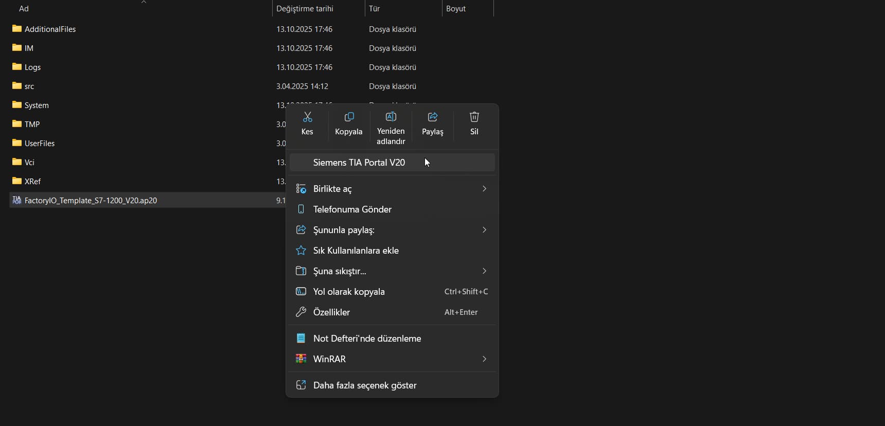 Bu projede gerçekleştirilen senaryoda TIA Portal V20 ile PLCSIM üzerinden Factory I/O haberleşmektedir. Bu işlemin gerçekleşebilmesi için Factory I/O template dosyası gerekmektedir. Bunun için Factory I/O Template adresinden ilgili dosya edinilmiştir.