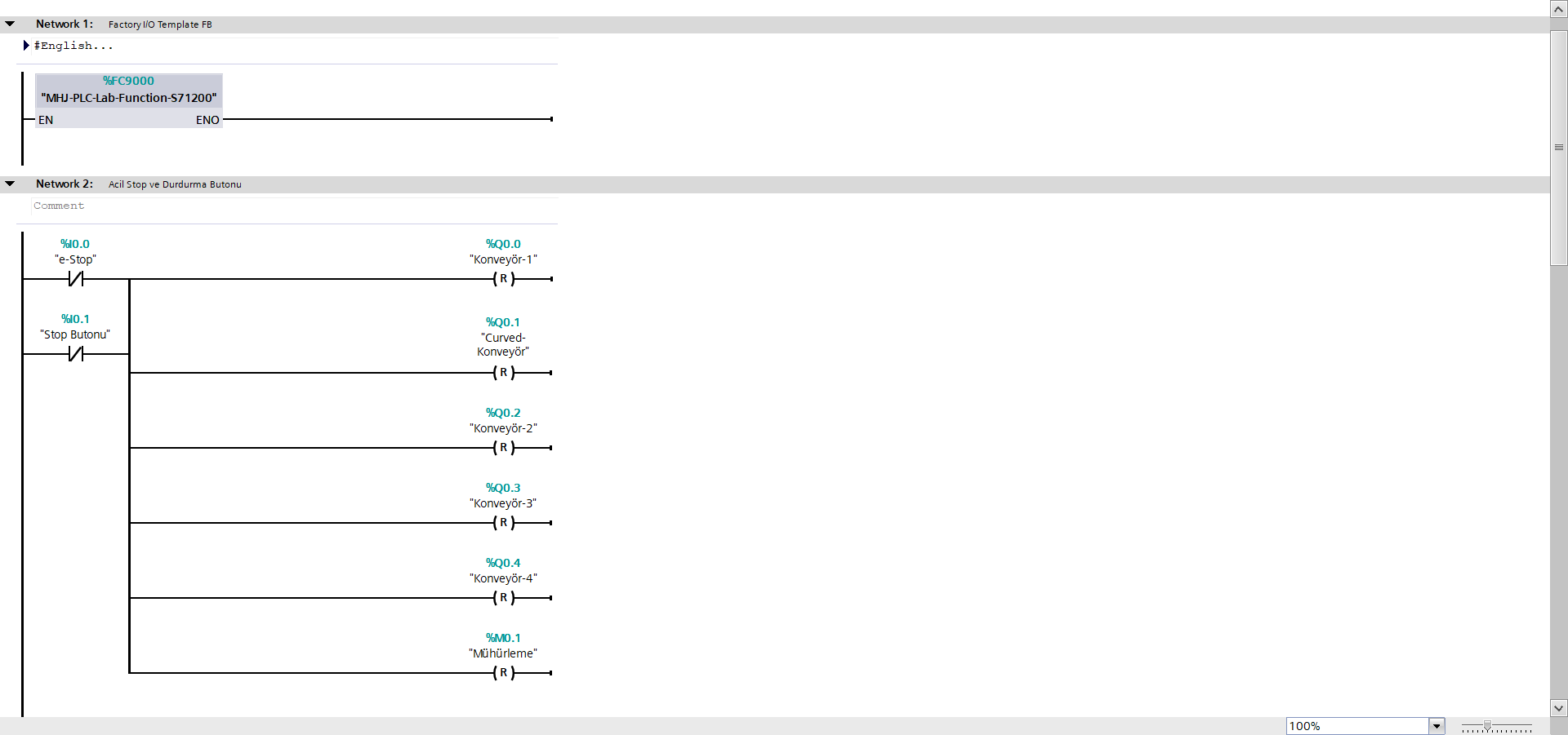Template dosyası TIA Portal arayüzünde açıldıktan sonra uygulanmak istenen senaryoya yönelik program hazırlanmıştır.