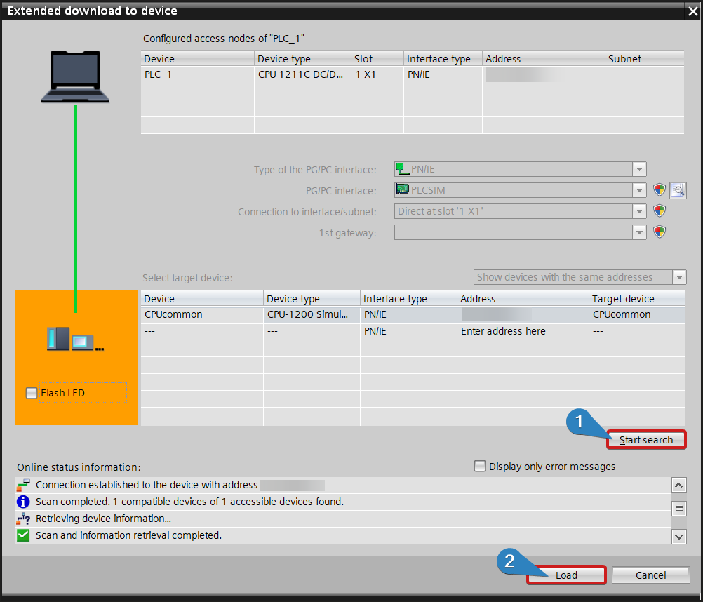 Açılan ekranda “Start Search” yaparak bağlı olunan cihazlar listelenmektedir. Bu işlemi yaparken “PG/PC Interface : PLCSIM” seçeneğinin belirtildiği gibi olması gerekmektedir. Arama sonucunda PLCSIM PLC seçilerek program “Load” denilerek yüklenmiştir.