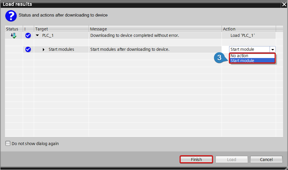 Devamında açılır listeden “Start Module” seçeneği seçilerek “Finish” butonuna basılarak işlem tamamlanmıştır.